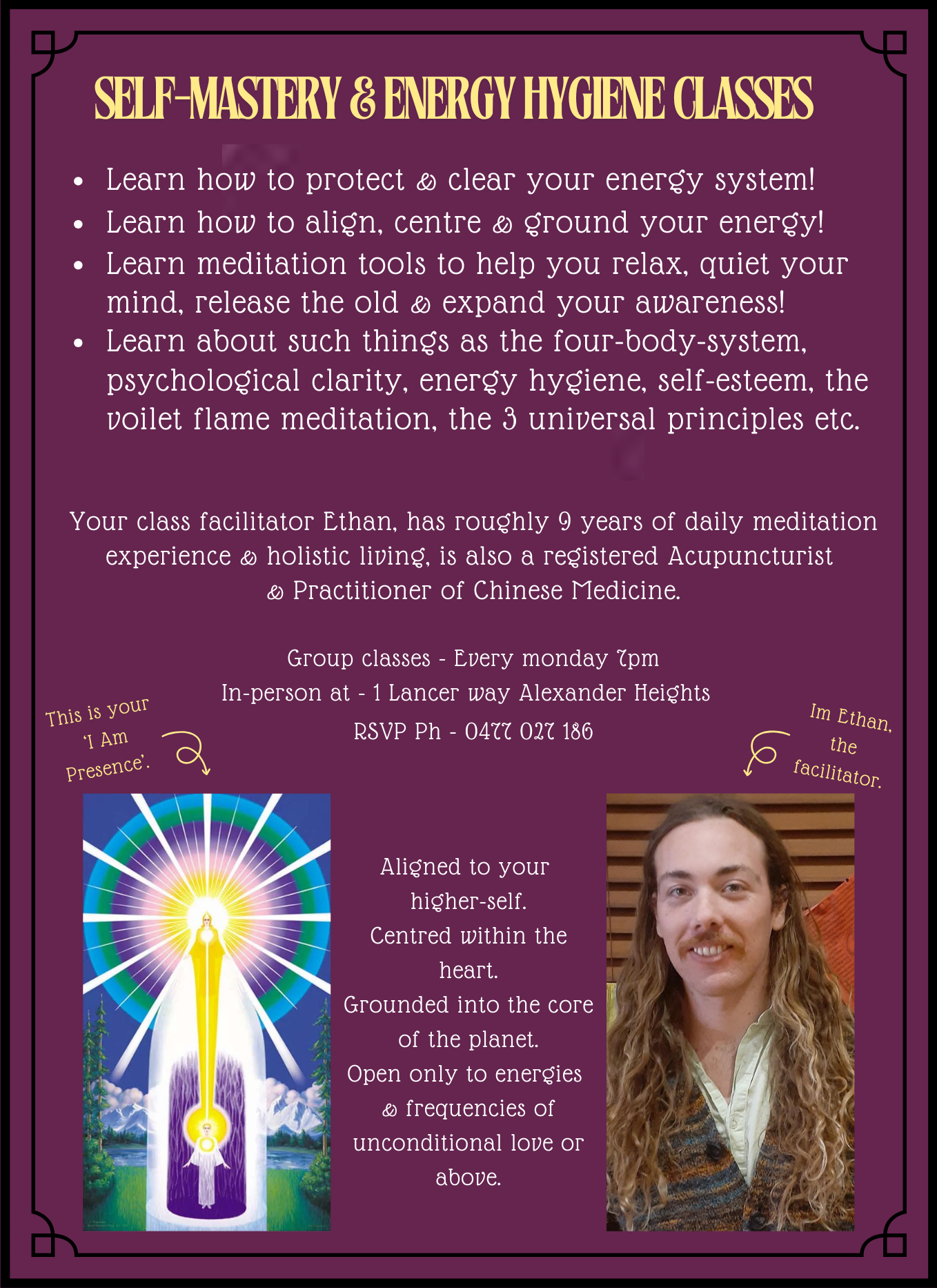 Ethan facilities weekly classes & individual sessions on 'Energy Hygiene', emphasising Grounding, Heart Centred Alignment, Psychological Clarity, Emotional Regulation & Self-Care. Group classes every Monday at 7pm at the clinic or 1 hour private consults.